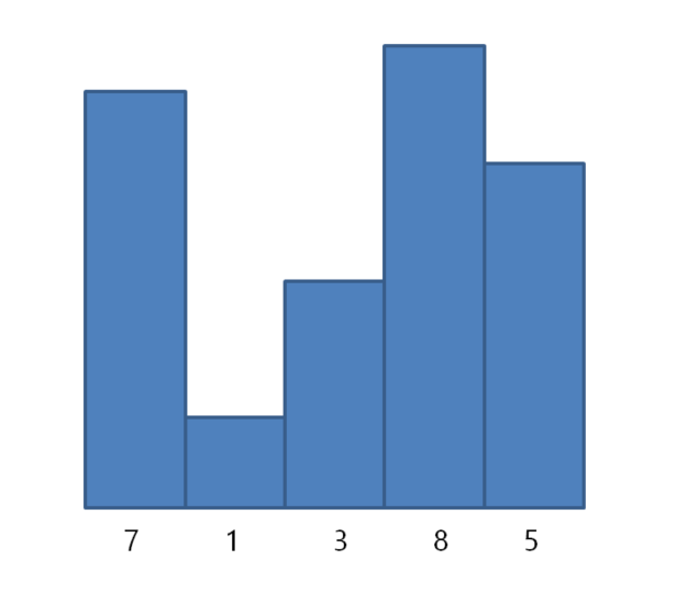 허나, 여기서 그치지 않고, 또 각 직사각형에서 최솟값을 유발하는 높이를 제외한 다음에 또 좌우로 만들어지는 직사각형의 넓이를 구해나간다면 최댓값을 찾을 수 있다.