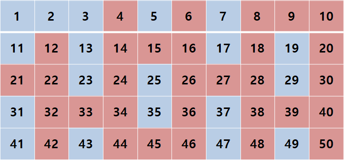 특정한 수의 제곱근으로도 충분히 구할 수 있기 때문에 50까지 할 필요 없고, 50의 제곱근까지 범위를 잡고 50의 제곱근의 배수들을 지워내면 된다.