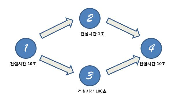 1, 2, 3, 4 모든 건물을 지어야 하기 때문에 1번 건물 (10초) + 3번 건물 (100초) + 4번 건물 (10초)