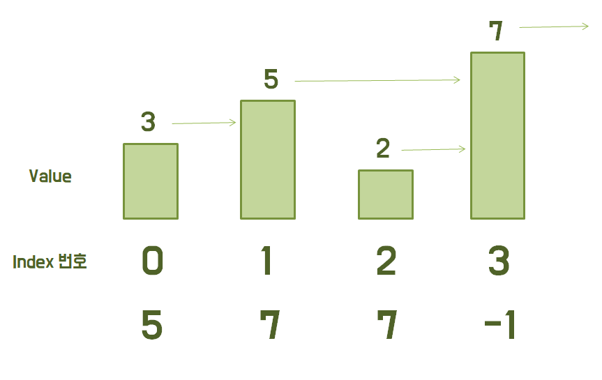 예를 들어 {3, 5, 2, 7}과 같은 배열이 있고, 어떠한 배열의 원소(N)가 있을 때, N보다 큰 수가 N의 자리로부터 제일 처음 나타는 원소를 N으로 가져라(라는 느낌)