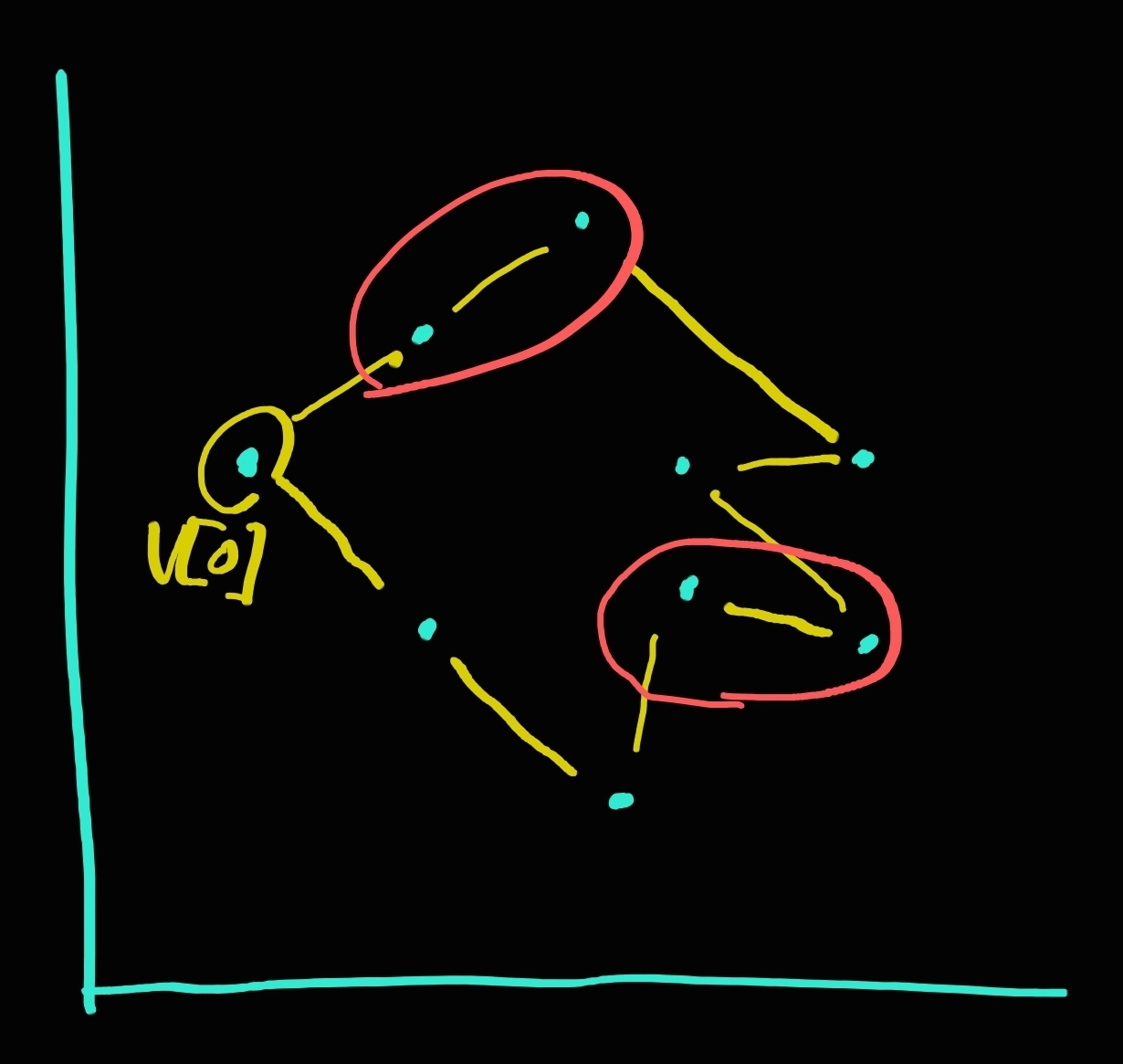 그리고, 빨간색으로 동그라미 친 부분들은 v[0]에서 직선을 그었을 때, 모두 한 직선 위에 있는 점들입니다.