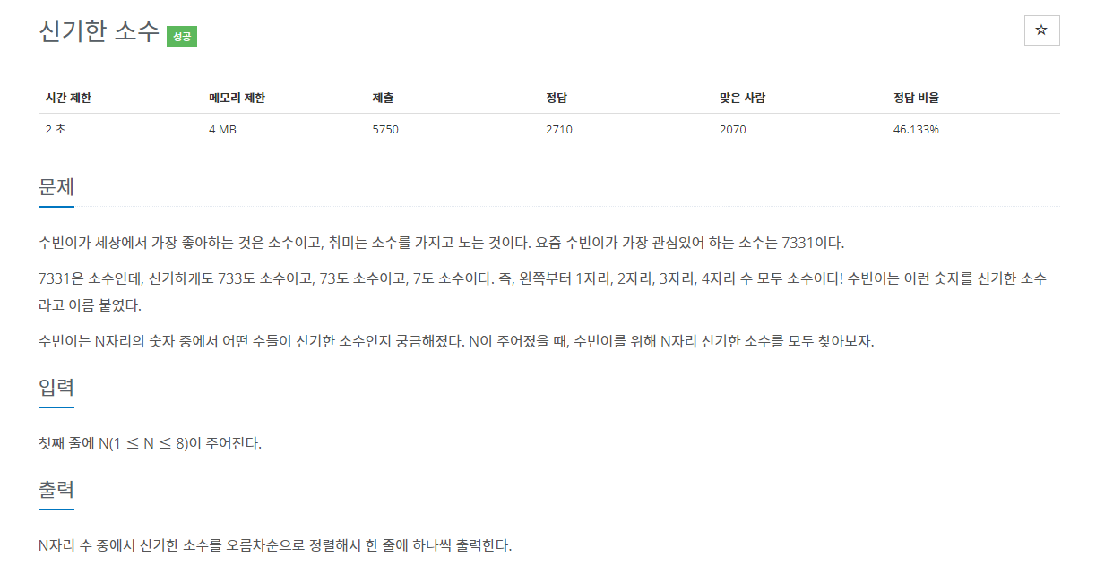 입력으로 4가 주어지면 4자리 수 중에 예를 들어 7331이면 맨 앞자리부터 7, 73, 733, 7331처럼 모두 소수가 되어 만족하는 수들을 구하는 문제였다.