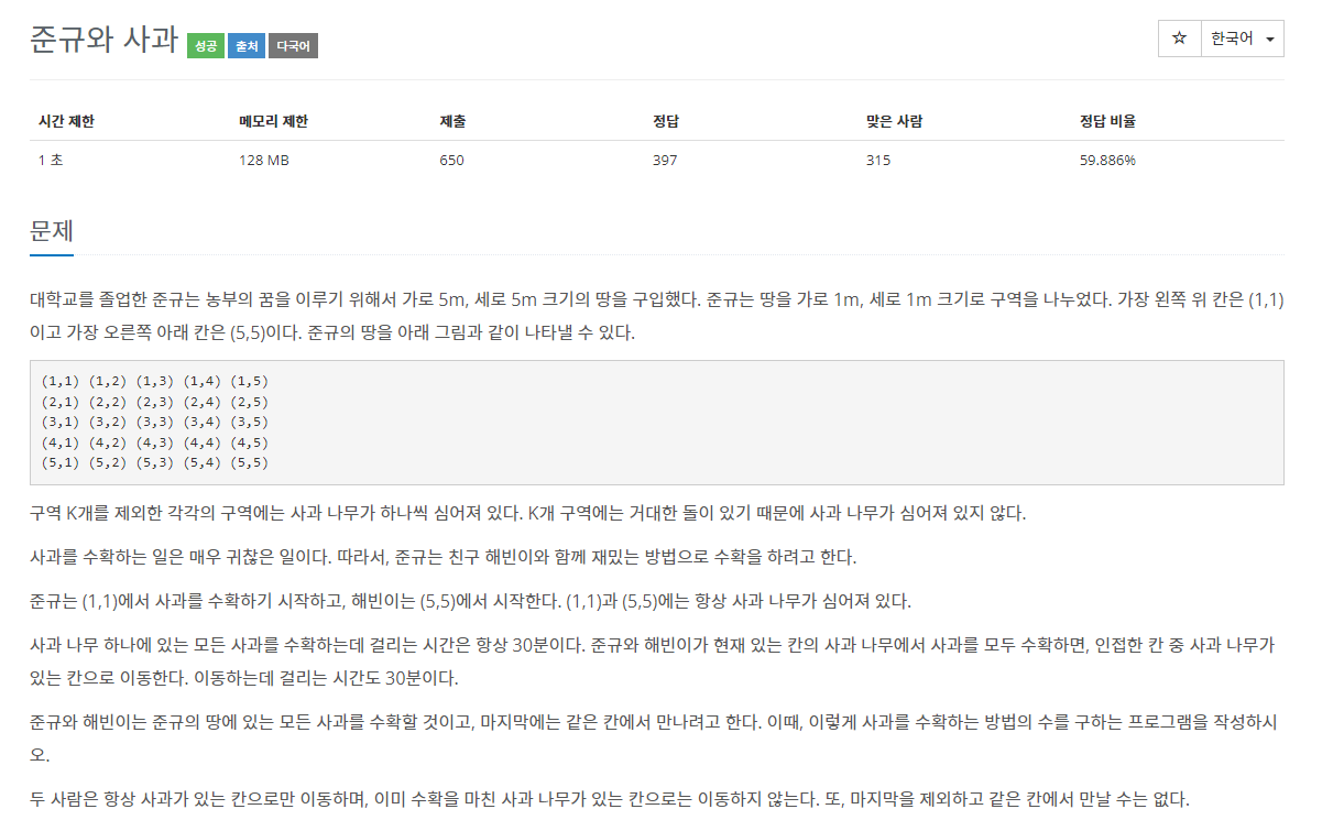 문제 링크입니다: https://www.acmicpc.net/problem/5913 준규와 해빈이 둘 다 고려해야한다고 생각들 수 있는 문제이지만 사실 준규가 해빈이의 시작점까지 갈 수 있는 방법의 수를 구하는 문제였습니다.