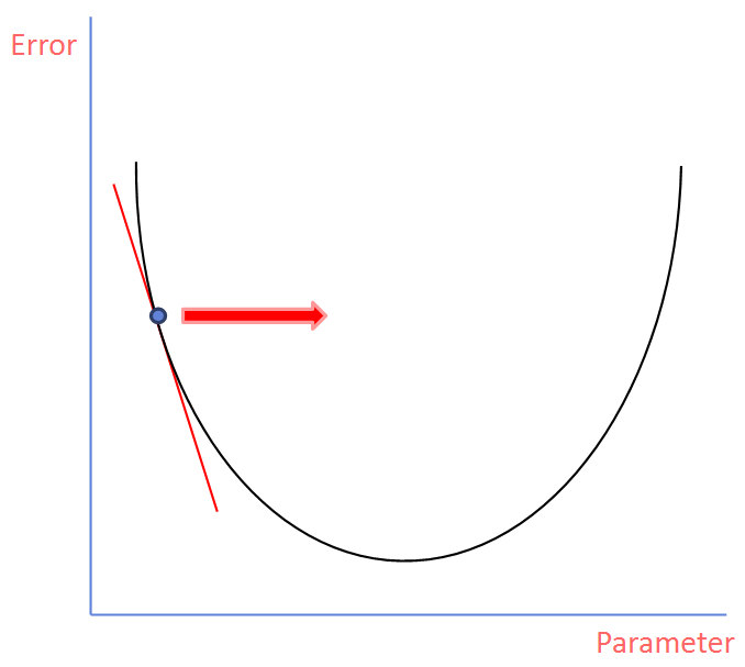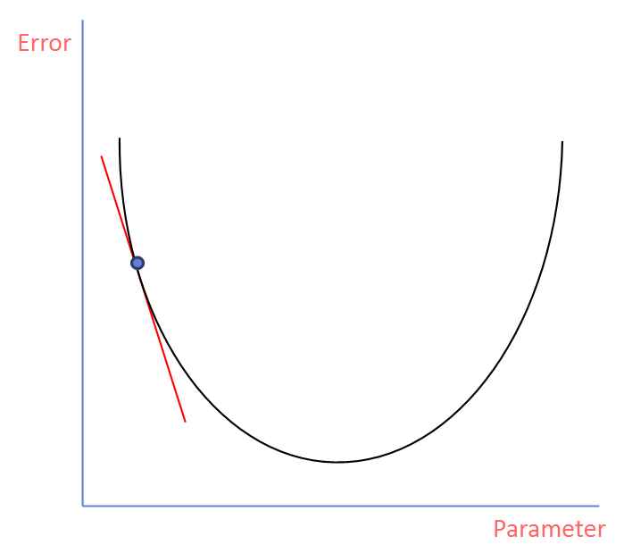 하지만, 단번에 이 값을 찾을 수 없기에 최적 값을 찾아가는 과정에 대해 알아봅시다. 우선 랜덤 하게 Parameter가 주어지면 아래와 같이 해당 점에서 미분 값을 구합니다. 그리고, 이 미분 값은 이 표의 그래프에 대해 기울기가 됩니다.
