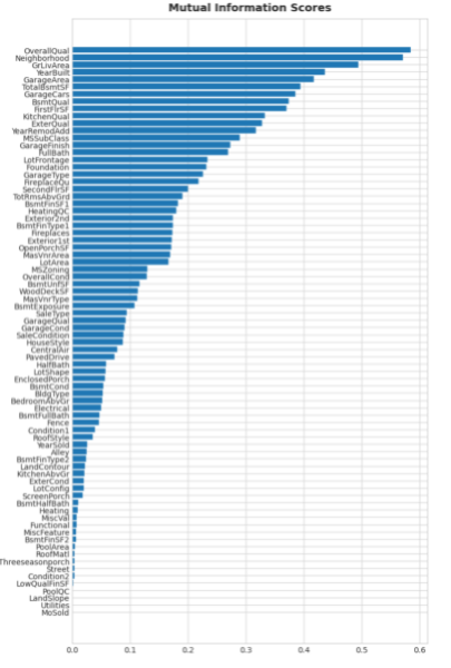 MI Score가 가질 수 있는 가장 작은 값은 0.0입니다. MI Score가 0일 때는 '두 변수가 서로 독립적이다'라는 것을 말하며 두 feature에 대해 말 할 수 있는 것이 없습니다. 반대로 가장 큰 값은 이론적인 관점에서는 한계가 없습니다. 실제로는 2.0 이상을 넘어가는 경우가 드뭅니다.