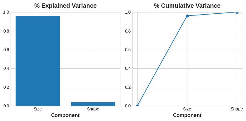 PCA는 각 성분의 변화량을 보여줍니다. 아래 figure에서 'Size'가 'Shape'보다 데이터를 따라 더 변화량이 많다는 것을 보여주고 있습니다. PCA는 각 성분의 Explained Variance를 통해 이를 정확하게 표현합니다.