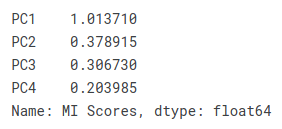 이제 주성분들의 MI Score를 알아봅시다. 당연하게도 PC1이 가장 높은 점수를 받는 것에도 불구하고, 비록 다른 주성분들이 작은 변화량이었지만 price(target)과 의미 있는 relationship이 있다는 것을 알 수 있습니다. 이러한 사례로 보았을 때, PC1에 제한되지 않고, 다른 주성분들도 가치가 있다는 것을 알 수 있습니다.