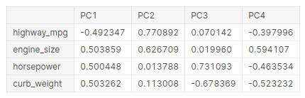 PC3를 기준으로 데이터프레임을 내림차순으로 정렬한다면, 마력(horsepower)이 높고 차량 중량(curb_weight)이 낮은 상태로 정렬이 되어 나타날 것입니다.