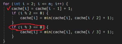 하지만 if문에서 3이 3으로 나누어지기 때문에 cache[3]과 cache[3 / 3] + 1중 작은 값을 넣으라는 것을 볼 수 있다.
