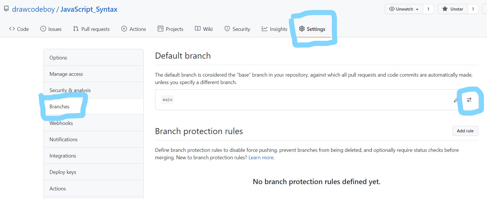 Settings-Branches-Default branch-교차화살표