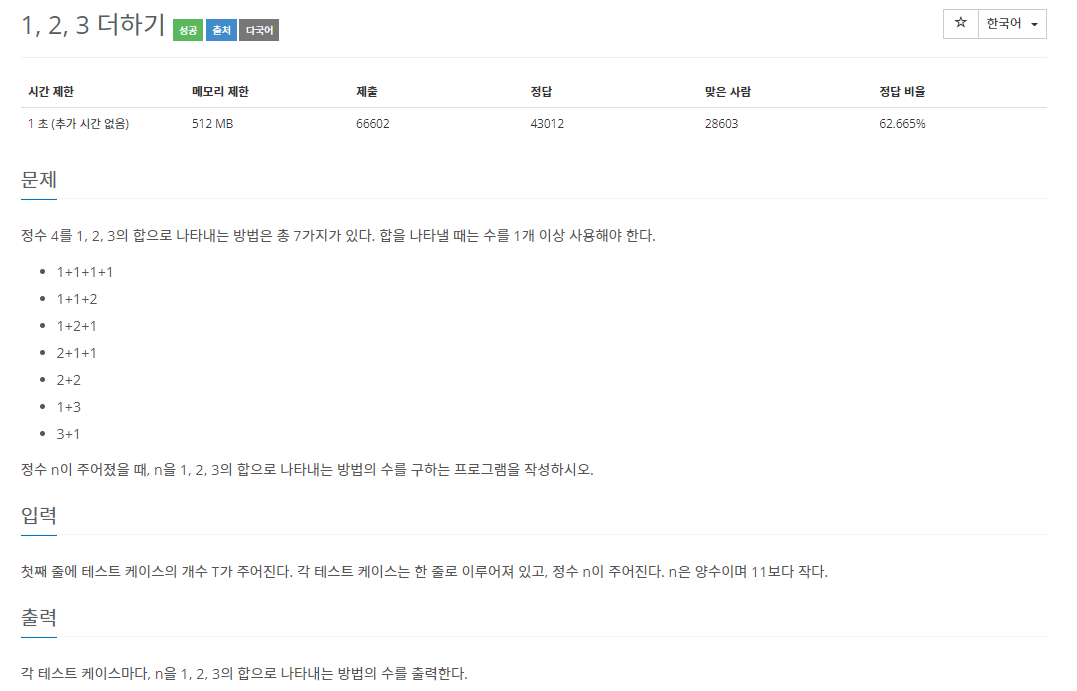 1, 2, 3 더하기 문제 정수 4를 1, 2, 3의 합으로 나타내는 방법은 총 7가지가 있다. 합을 나타낼 때는 수를...