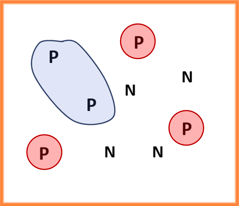 Precision이 독단적으로 높은 케이스를 생각해 봅시다. 아래와 같이 FN의 비율(빨간 원)이 높아진다는 것을 캐치한다면 Precision이 높을 때, Recall이 낮아지는 원인에 대해 도출할 수 있습니다.