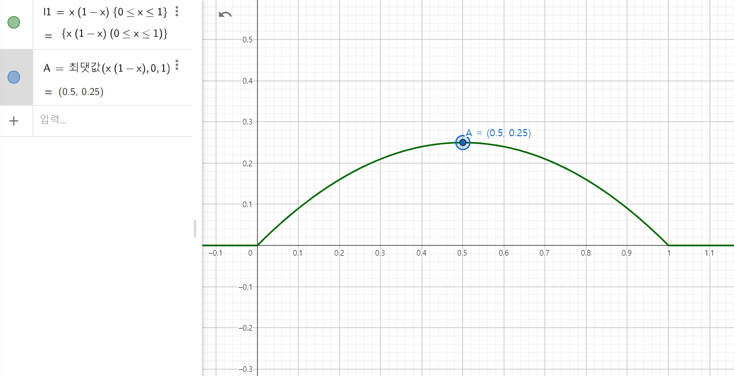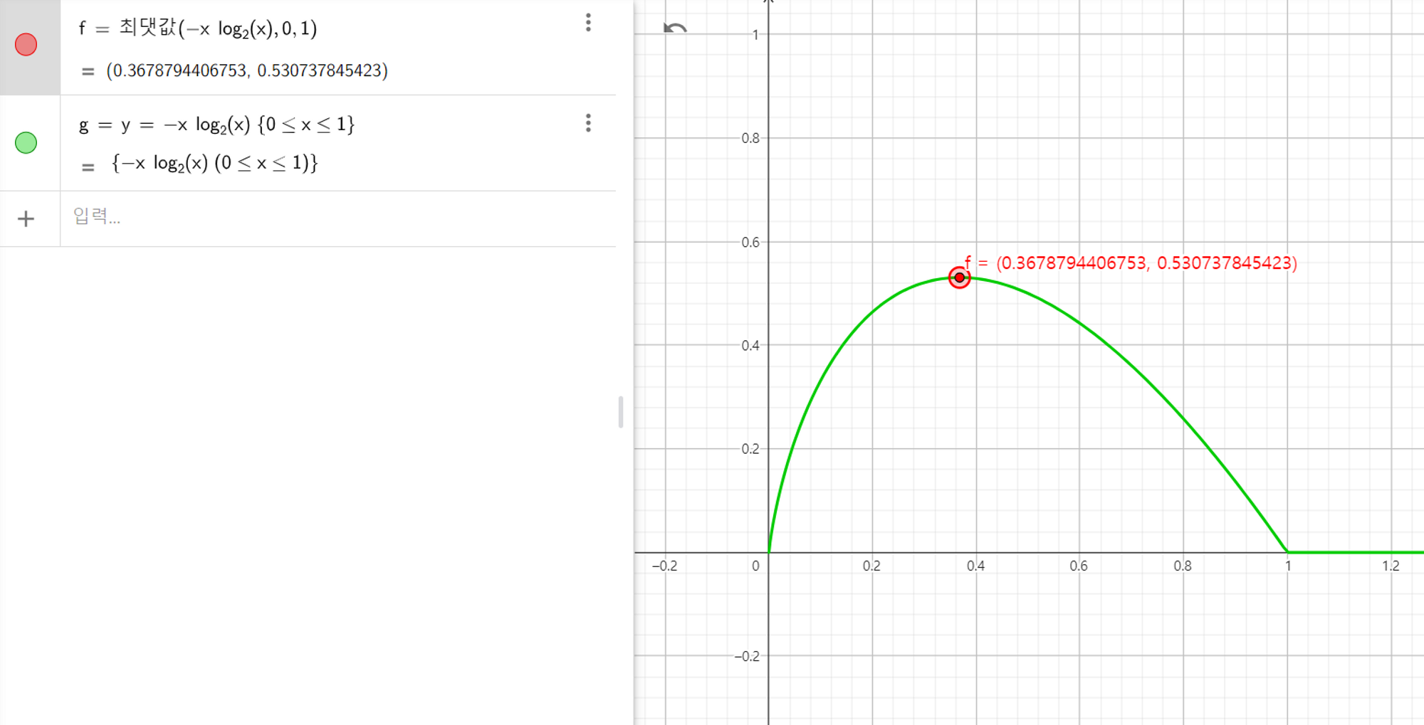 ํด๋์ค์ ๋น์จ์ด ๊ทน์ ์ผ์๋ก ์ํธ๋กํผ๊ฐ ๋ฎ๊ฒ ๋์ต๋๋ค. ์ด๊ฒ ๊ฐ๋ฅํ ์ด์ ๋ Geogebra๋ฅผ ํตํด \(-x\log_{2}{x} (0 \leq x \leq 1)\)์ ๊ตฌํํด ๋ดค์ต๋๋ค.
