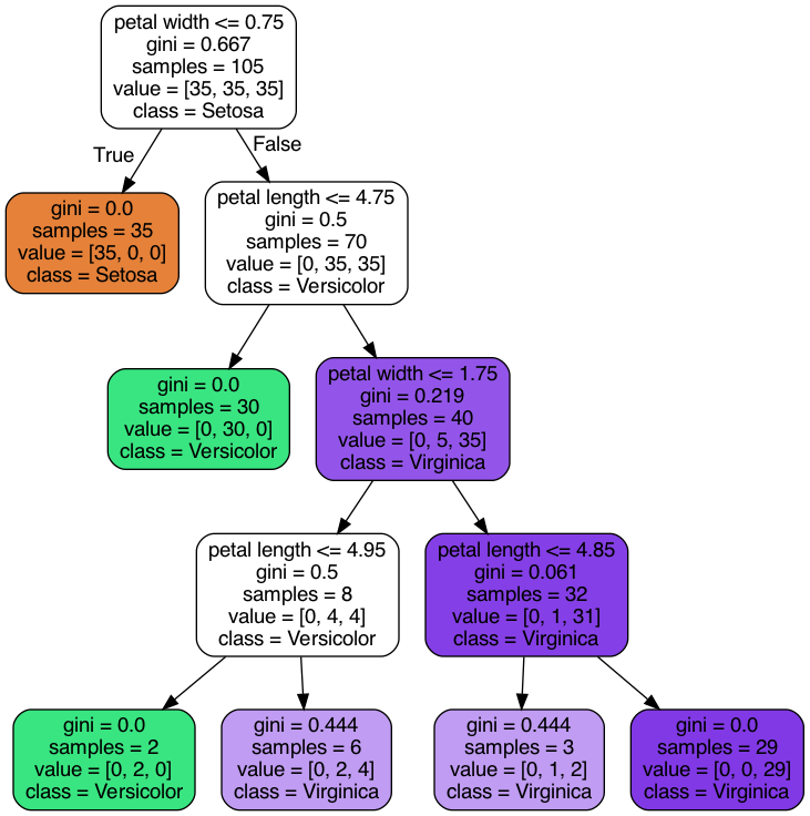 ์๋ Decision Tree Visualization์์ ๊ทธ ๊ธฐ์ค์ Root Node์ ์๋ petal width <= 0.75๋ Right-Child Node์ ์๋ petal length <= 4.75์ ๊ฐ์ ํ