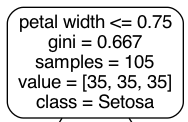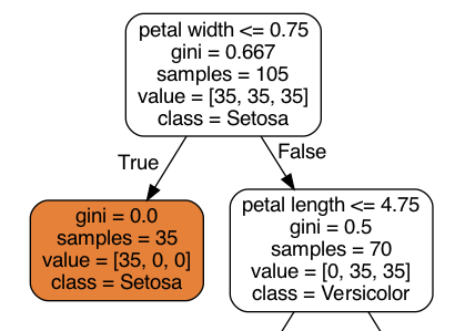 - 0.334๋ผ๋ ๊ฐ์ฅ ํฐ Information Gain์ด ๋ง๋ค์ด์ง๊ฒ ๋ Feature๋ 'petal width'์ ๊ธฐ์ค ๊ฐ์ 0.75์ด๋ค.