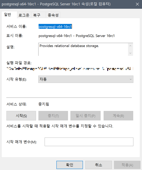 이는 Win + R을 통해서 services.msc를 접속하여 postgresql 서비스를 의도적으로 아래 그림과 같이 시작해 주면 해결되는 문제입니다. -> 문제 해결!