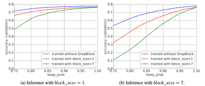 결과는 위와 같이 Drop을 하는 Feature Map(Block size)가 커질수록 성능이 좋아짐을 보였습니다.