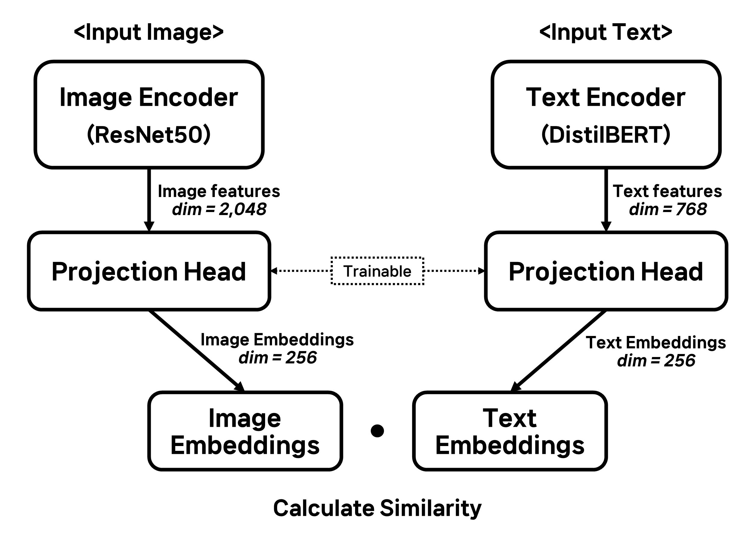 각 Encoder(Pre-trained Model)를 통해서 Image features, Text features를 추출해 주었습니다. 각 features는 (batch_size, 2048), (batch_size, 768)의 shape을 가지고 있습니다. 이제 이 features를 CLIP을 위해서 동일한 차원으로 Embedding을 만들어주어야 합니다. '아까부터 왜 features를 추출하고 이젠 Embedding까지 만드느냐?'에 대한 질문은 바로 아래의 Similarity에서 다룰 것이니 조금만 기다려주세요:)