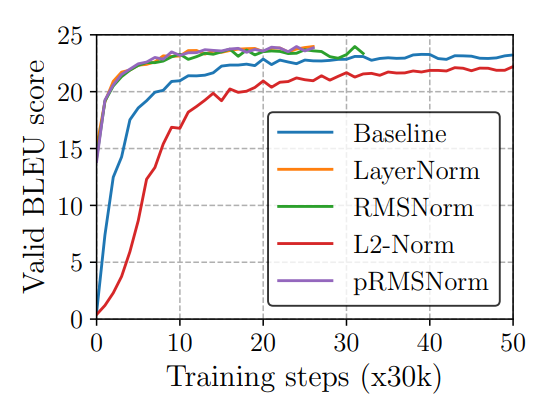 Computational Overhead를 줄이는 것으로 RMS Nomalization을 제안했지만, 이것이 기존 Layer Nomralization과 성능이 유사하다는 것을 Valid BELU score를 측정하는 것을 통해서 밝혀냈습니다.