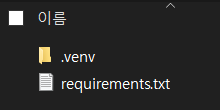 μλ¬΄νΌ μμ κ°μ΄ .venvλΌλ μ΄λ¦μ κ°μ νκ²½μ μμ±νλ©΄, ν΄λΉ μμΉμ μλ κ·Έλ¦Όκ³Ό κ°μ κ°μ νκ²½ λλ ν°λ¦¬κ° μκΈ°κ² λ©λλ€.