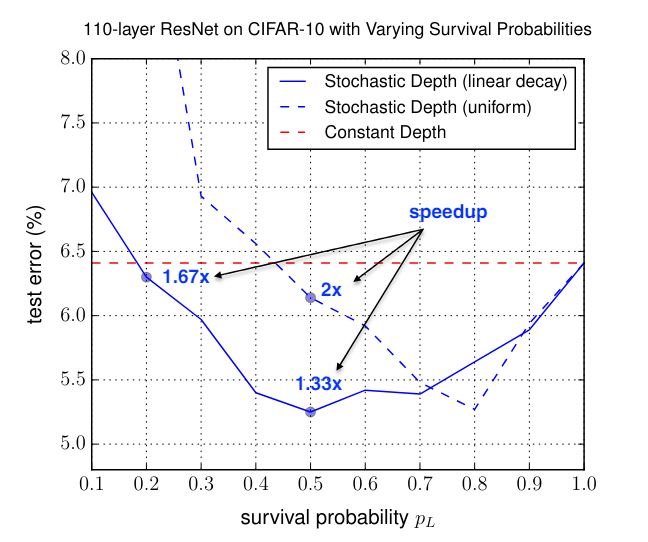 ๋ํ, Survival probability๊ฐ 0.2์ผ ๋๋ ์ฑ๋ฅ ์์ฒด๋ DropPath๋ฅผ ์ฌ์ฉํ์ง ์์ ๊ฒ๊ณผ ๋น์ทํ๋ฐ, ํ์ต ์๊ฐ์ 40%๋ก ํ ์ค์์ต๋๋ค.