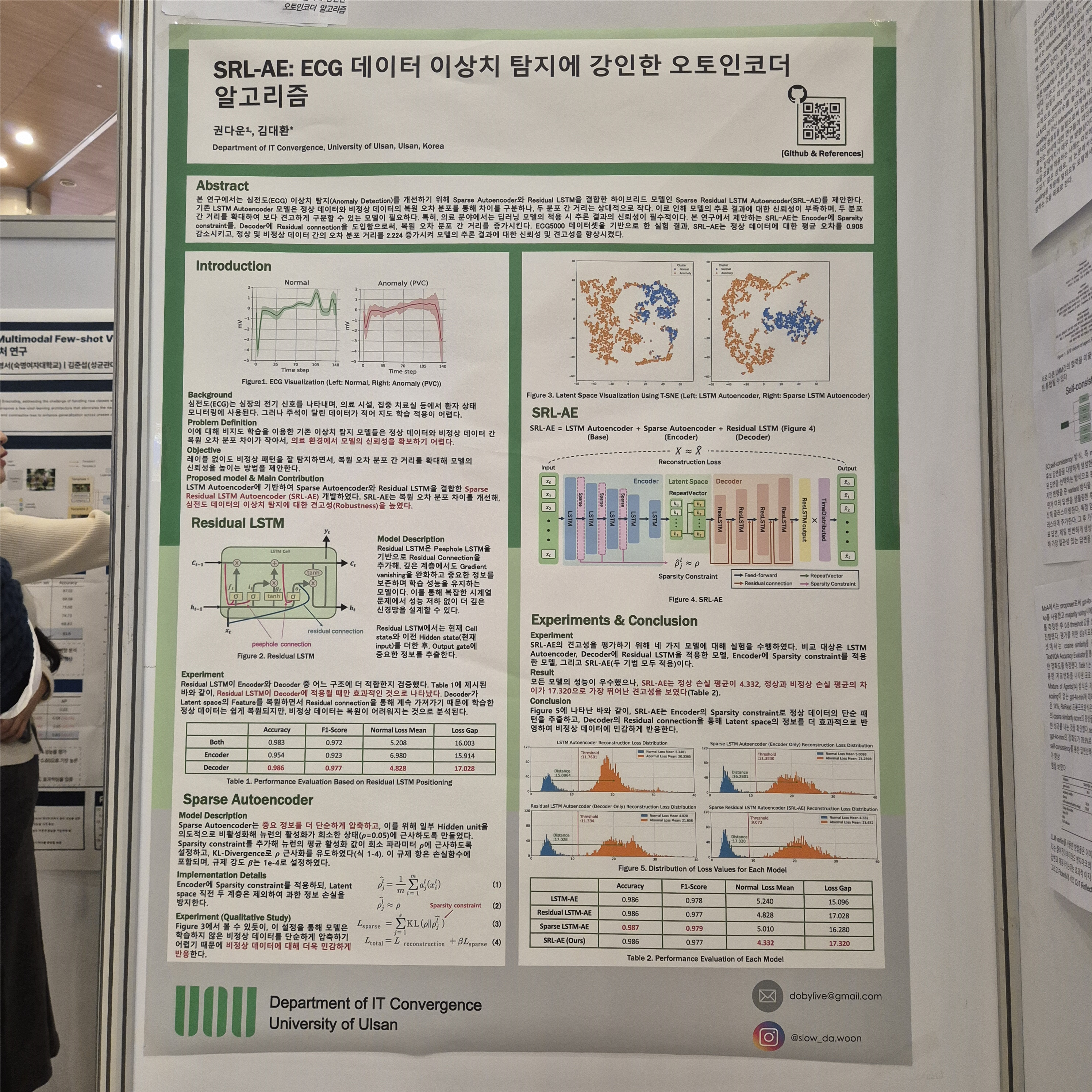 본 연구는 ECG의 Anomaly Detection을 Autoencoder를 통해 수행하는 Task에서 모델 추론 결과에 대한 신뢰성을 보장하기 위해 새로운 모델 'Sparse Residual LSTM Autoencoder(SRL-AE)'를 제안했습니다. Medical AI 필드에서도 딥러닝은 많은 발전을 이루었으나, 실제 시장에 도입되기에는 여러 문제가 있습니다. 그중 하나는 AI에 대한 신뢰성이라 생각했고, 이에 대해 기여할 수 있는 주제로 설정하였습니다.