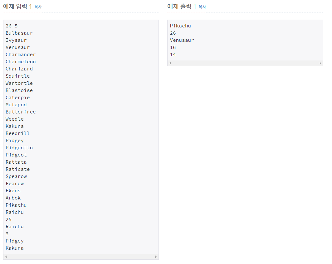 결론적으로 다음 단어들을 입력하고, 숫자를 입력하면 이름을, 이름을 입력하면 숫자를 출력하는 문제이다.