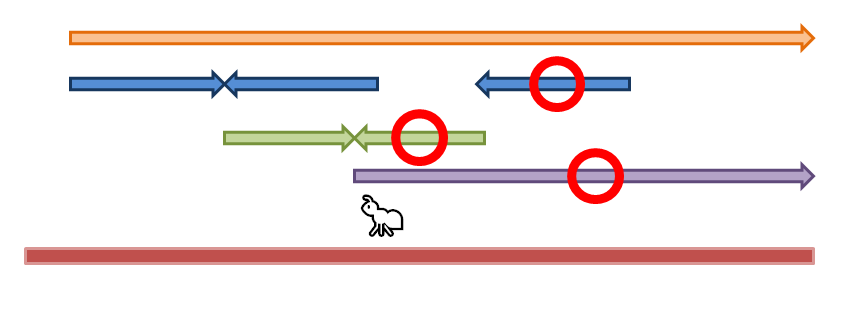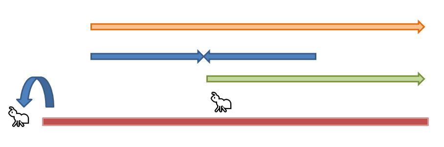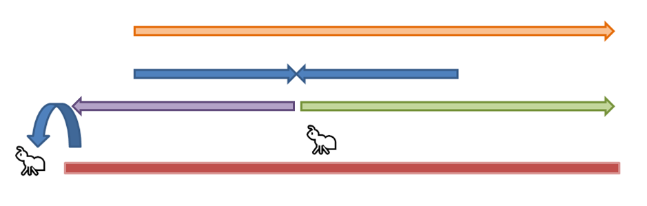 파란색 화살표만큼 가서 부딪히게 된다. 3번 개미에게도 시간이 흐르니 똑같은 거리만큼 간다.