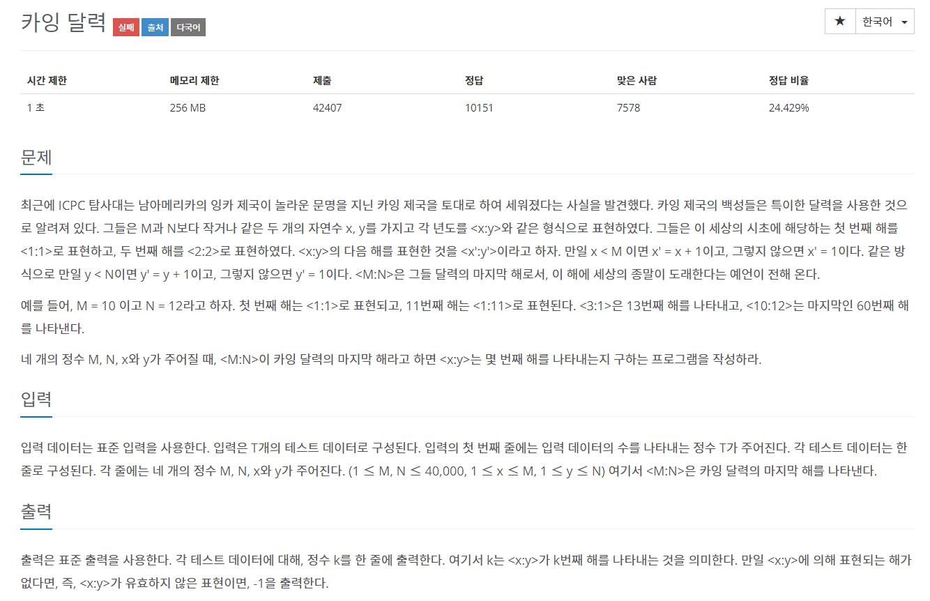 [알고리즘] 백준 6064번 카잉 달력 (C++), 정수론..? 본문