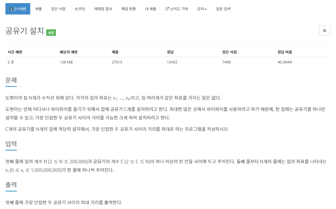 그와 반대로 어떠한 거리가 공유기가 설치될 수 있는 개수보다 작으면 거리를 좁혀서 탐색해나가는 논리였다.