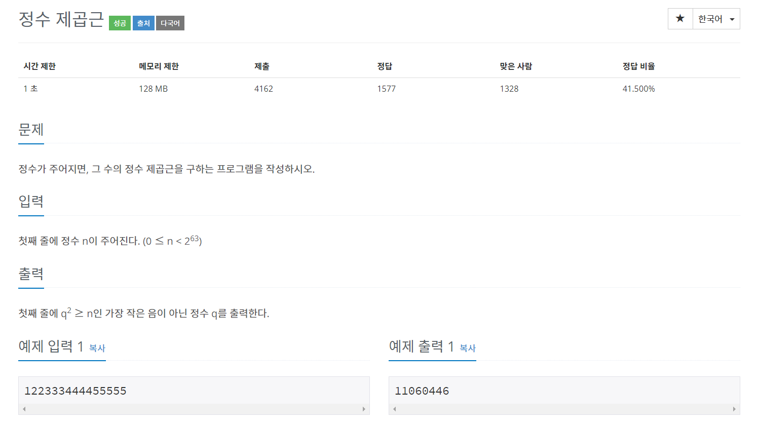 [알고리즘] 백준 2417번: 정수 제곱근 (C++), 더 큰 정수 자료형 unsigned long long