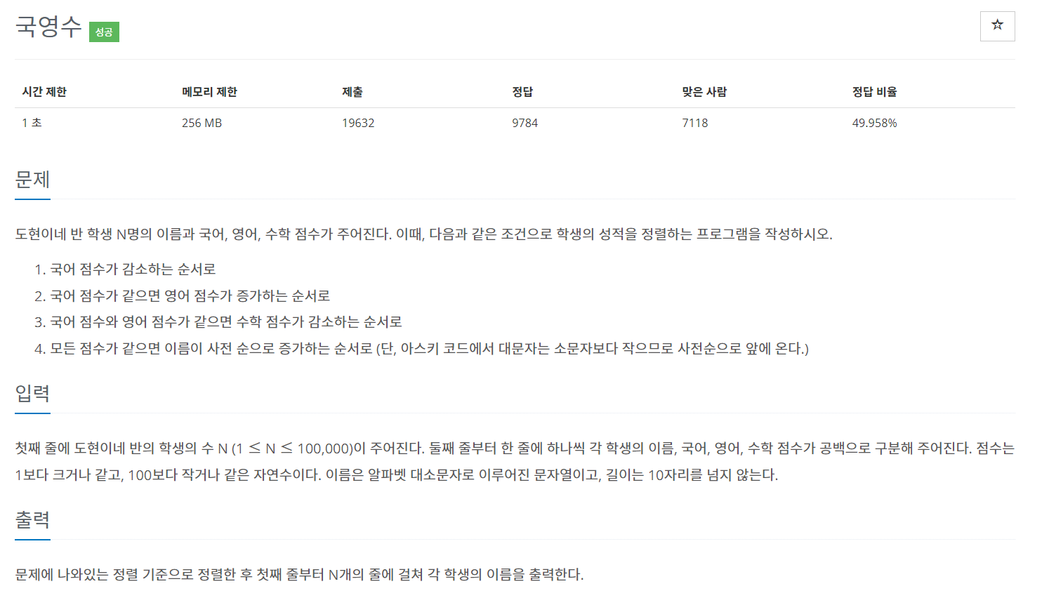 [C++] 백준 10825번: 국영수, 구조체 선언, 입력 자료형을 무시하지 말자