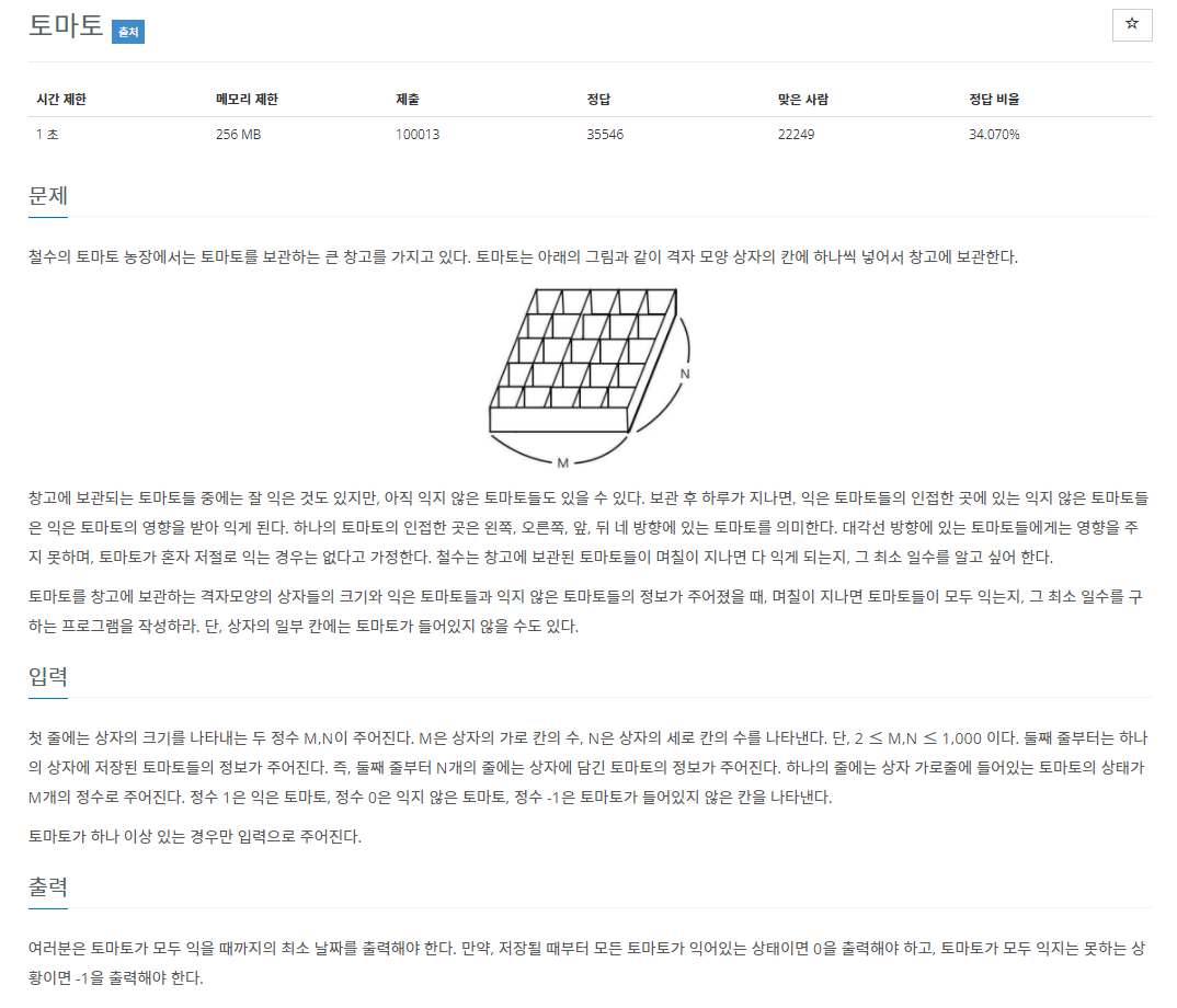 문제 번호 7576(https://www.acmicpc.net/problem/7576) 문제 및 입/출력 철수의 토마토 농장에서는 토마토를 보관하는 큰 창고를 가지고 있다. 토마토는 아래의 그림과 같이 격자 모양 상자의 칸에 하나씩
