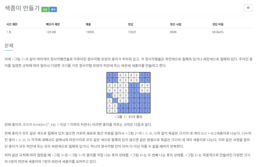 이번 분할 정복의 포인트는 문제에서 얻을 수 있었다. n이 2의 제곱수로 주어지고, 색종이들 또한 2의 제곱수 형태로 존재하기 때문에 N / 2로 분할해나가면서 리커시브 콜을 하면 됐었다.