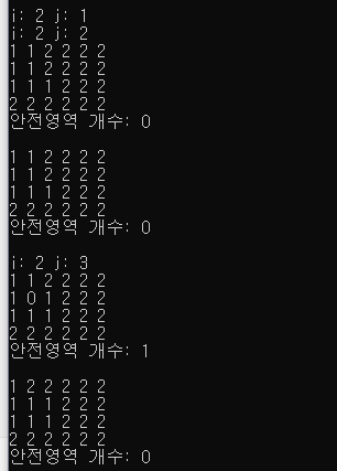 벽을 세운 후, 전염시킨 다음에 평면과 안전 영역의 개수를 출력해보니 특이한 점을 발견할 수 있었다.